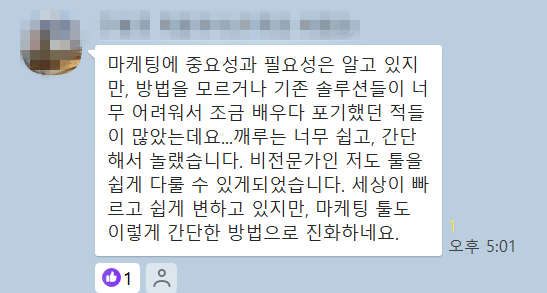 마케팅에 중요성과 필요성은 알고 있지만, 방법을 모르거나 기존 솔루션들이 너무 어려워서 조금 배우다 포기했던 적들이 많았는데요... 깨루는 너무 쉽고, 간단해서 놀랬습니다. 비전문가인 저도 툴을 쉽게 다룰 수 있게되었습니다. 세상이 빠르고 쉽게 변하고 있지만, 마케팅 툴도 이렇게 간단한 방법으로 진화하네요.