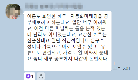 이름도 희안한 깨루. 자동화마케팅을 공부해보려고 하는데요. 일단 너무 어려워요, 예전 다른 퍼널짜는 툴을 본적 있는데 난리도 아니었는데요, 요상한 깨루는 심플한데요 일단 직관적입니다 문구수정이나 카톡으로 바로 보낼수 있고, 유튜브도 연결되고, 가격도 안 비싸서 좋네요 좀더 깨루 공부해서 다같이 돈법시다